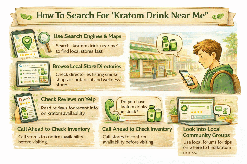To find a Kratom drink nearby, start with location-based searches on maps or search engines, then narrow results by checking store details and recent activity.